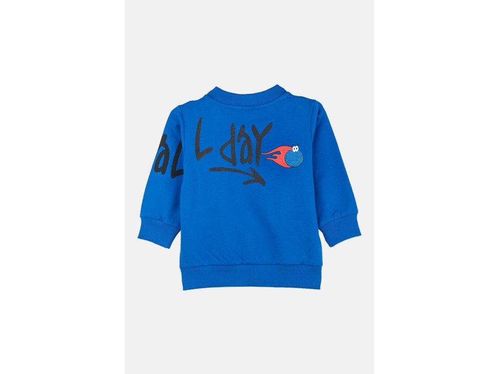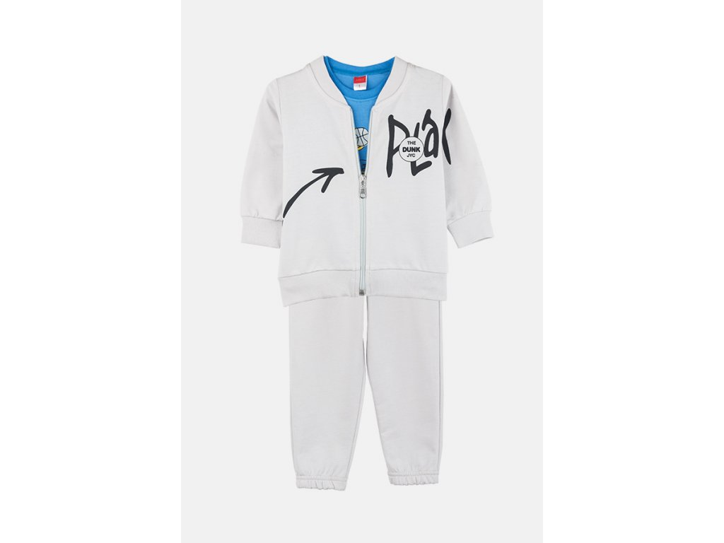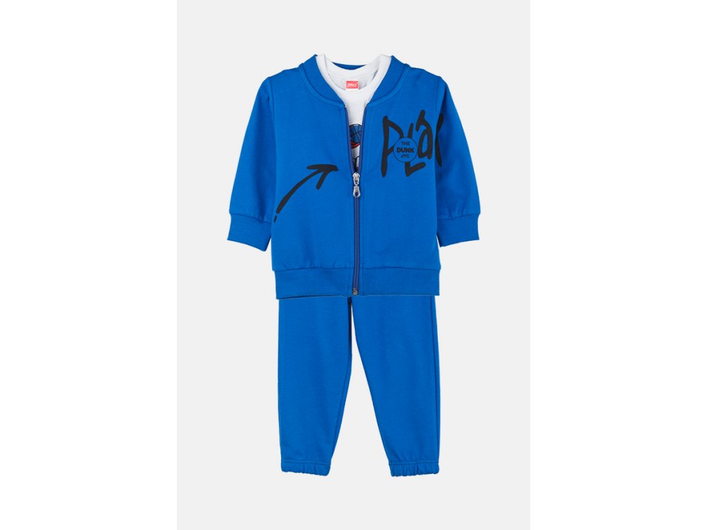 Spolehlivá a stylová dětská teplákovka je kousek, který nesmí chybět v žádném klukovském šatníku. A co když vám k ní navíc přidáme ještě tričko? Náš set se totiž skládá z mikiny na zip se stojáčkem, trička s krátkým rukávem a barevně sladěných tepláků. To vše připravené k zabalení do batohu na trénink nebo když se vypravíte do města do cukrárny. Tričko se chlubí tematickým potiskem. Tepláky v pase do gumy a s náplety u kotníků set vhodně doplňují.