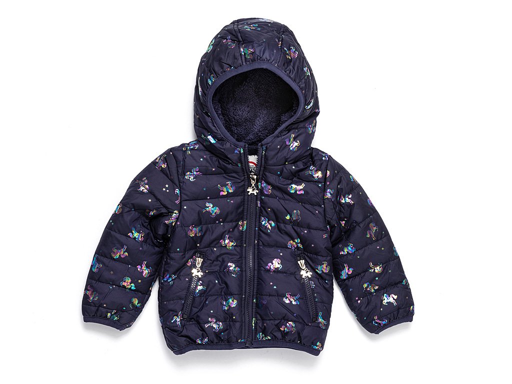 Měkká, nadýchaná bunda s prošíváním jako stvořená do sychravých dní podzimu a zimy, tak to je přesně ona! Teploučká bunda ze 100% polyesteru s kapucí má sytou tmavě modrou barvu s potiskem metalického jednorožce a zapíná se na zip. Vnitřek bundy dítě zahřeje jemným flísovým kožíškem.
