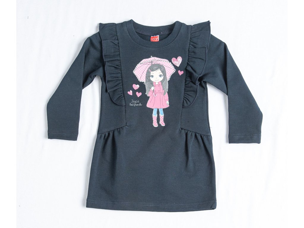 Dívčí šaty "BEST FRIENDS" jsou šaty v moderní tmavě modré barvě, kulatý výstřih, dlouhý rukáv. Na šatech je krásný potisk holčičky s deštníkem a ozdobný kanýrek na ramenou. Vnitřní strana šatů je příjemný fleece, který se dětem perfektně nosí a nekouše. Tyto šaty se krásně hodí k punčochám nebo k legínkám.