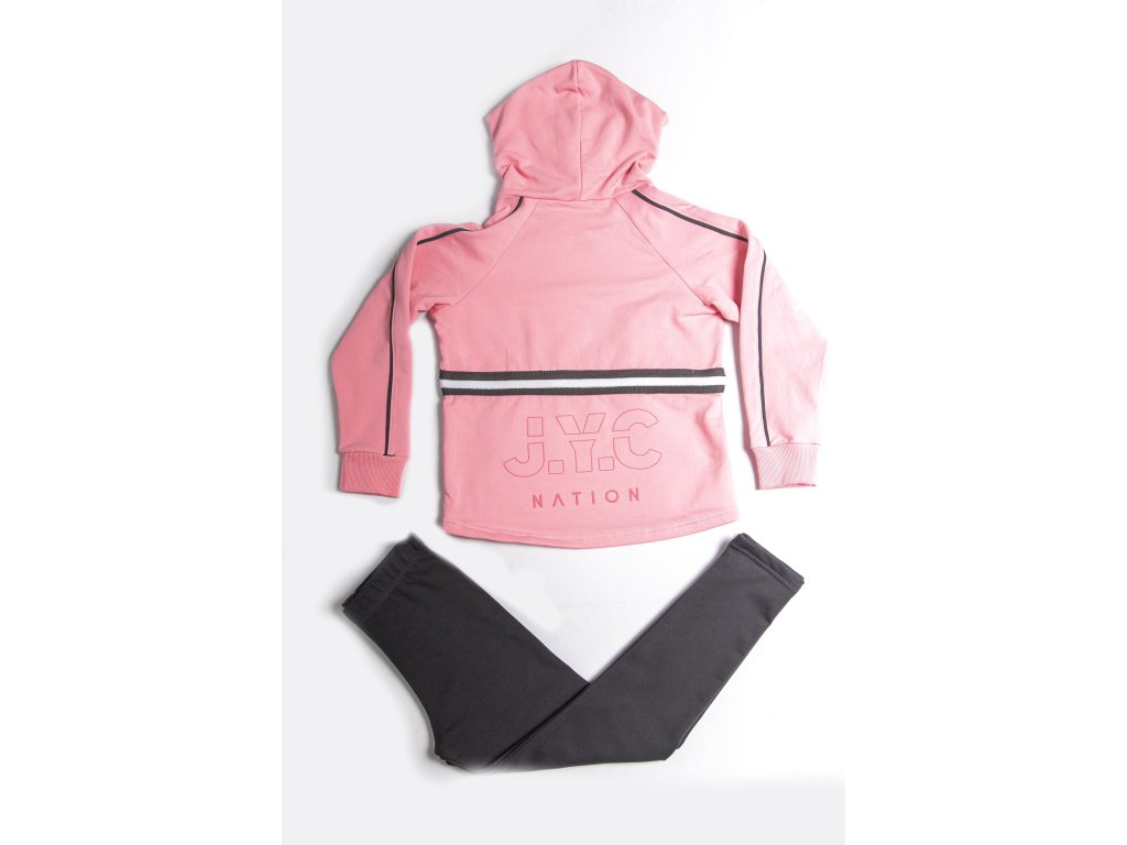 Dívčí souprava "J.Y.C." se skládá z mikiny a legín. Mikina má růžovou barvu, s kapucí, dlouhý rukáv, jemný potisk J.Y.C. na zadní dolní části, klokaní kapsu, zajímavý bílo-šedý proužek všitý středem mikiny po celém obvodu. Jednoduché tmavě šedé legíny, v pase do gumy, bez kapes. Sportovní a jedinečná souprava, z kvalitní bavlny, která se hodí pro všechny příležitosti malých slečen.
